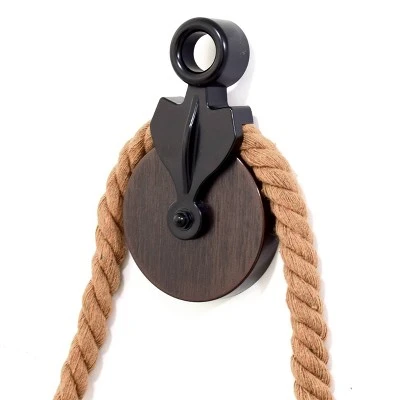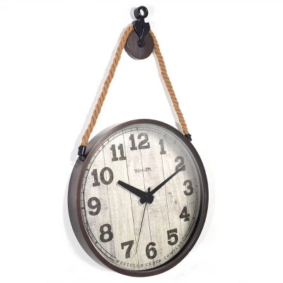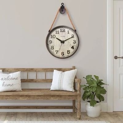 - Wood grain wall clock has decorative rope handle and pulley for hanging