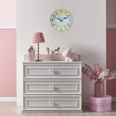 Add a touch of vintage flare to your home decor with a Stonebriar 14″ round vintage farmhouse wall clock. This clock features a worn blue, white, and yellow painted wood print on MDF with lightly distressed black Arabic numbers for an antique feel. Clock comes with attached keyhole hanger and is easily installed with a screw or wall hook (not included). Wall clock measures 14 inches in diameter and is the perfect size for over the mantel or as an accent for your kitchen, bedroom, office, or living room. Wood clock is battery operated and requires a single AA battery (not included).