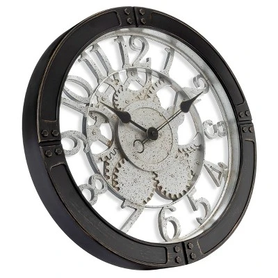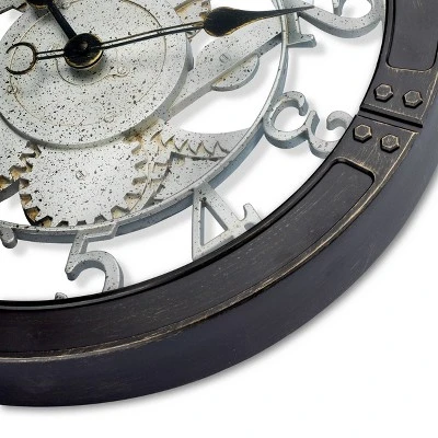 This bold industrial gear wall clock is sure to make a statement. Westclox 16” gears wall clock showcases a beautifully detailed dial. Complete with 3 dimensional gears in a silver patina finish. Large raised numbers make it easy to read the time. The open dial design allows you to see through gears and numbers exposing the wall behind. Enclosed in industrial black frame that is inspired by structural steel I-beams. Complete with glass lens. Quality quartz movement ensures perfect time accuracy. Requires one AA battery to operate. Proudly made by Westclox, limited 1 year warranty.