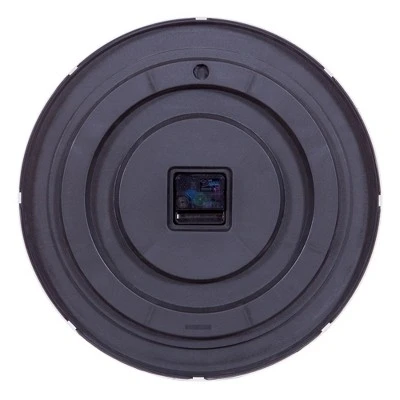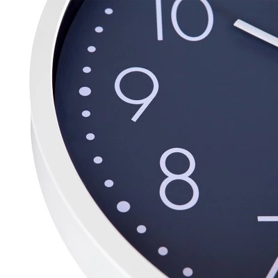 You can keep up with time with this essential 16 inch wall clock. Simplicity meets classic style with this timepiece making it perfect for the home, office or classroom. Linear white frame compliments its slate blue clock face. Large, easy to read numbers allow for greater visibility and a silent mechanism means no aggravating ticking. Mounts securely to any wall surface using mounting brackets on the back of the frame. Modern wall clock measures 16.5 inches in diameter and 2 inches deep. Requires two AA batteries.