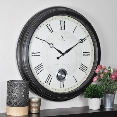 - IT’S IN THE DETAILS – This round clock is crafted of plastic with a oil-rubbed bronze frame. This timepiece includes a swinging silver pendulum.