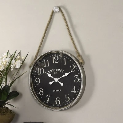 Antiqued, aged ivory finish with rust undertones and distressed, matte black clock face. Rope accent allows the wall clock to hang from the decorative hook that is included or may be hung without the rope. Quartz movement ensures accurate timekeeping. Requires one “AA” battery.|Coastal|Industrial|Lodge|Transitional||Black|Gray|wall clocks, antiqued, aged, ivory, black, rope