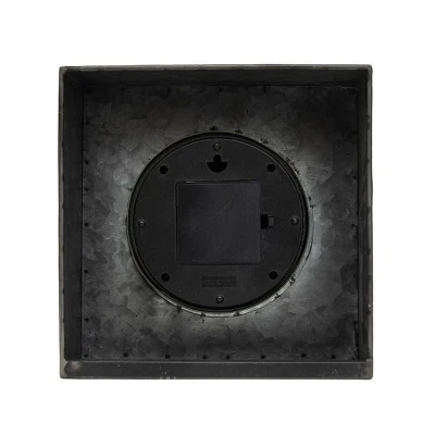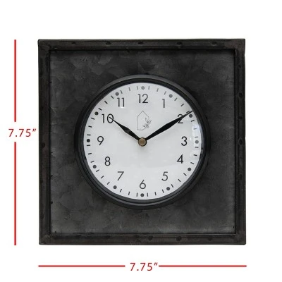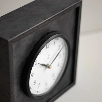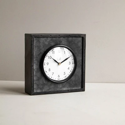 Keep track of time with this modern farmhouse style tabletop clock. The black galvanized metal structure features a glass cover over the clock face sealed with a black rim. The bold black and white color allow this clock to be styled with ease within your bookcase or on your tabletop, while still maintaining a timeless feel.