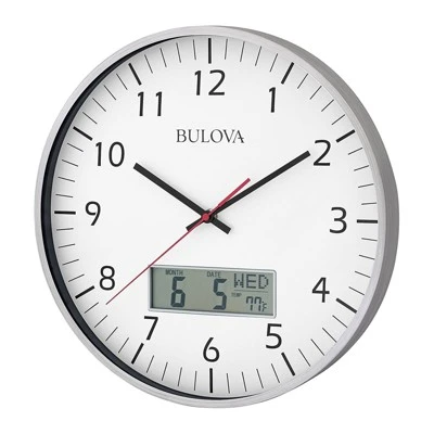 Decorative clocks let you tell the time at a glance and bring a sense of completeness to your home. The striking Bulova Clocks Glass Manager Wall Clock brings unique, modern style into your home or office.This oversize industrial wall clock features a clean brushed aluminum case glass lens, and quartz movement. The bright white dial and bold numerals allow easy reading from a distance, while the digital feature displays month/date/day, and Fahrenheit or Celsius room temperature readouts. Made for indoor use, this hanging wall clock features a wood-framed glass panel. This wall clock requires (1) AA battery for clock and (1) AAA battery for LCD display (not included).Set this clock in your living room, home office, dining room, or show it off in your office. The modern style of the Bulova Clocks Glass Manager Wall Clock sends a message in any room.