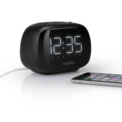 Wake up refreshed and recharged with this stylish, compact alarm clock radio. This clock radio from Capello features dual USB ports to charge two phones at once and Digital AM/FM radio with 10 presets to play your favorite stations in clear, digital audio. The large, 1.2″ white LED display inlcudes variable dimmer settings to adjust the brightness levels. Dual alarm settings and a nap and sleep timer help make this clock radio a perfect bedside companion or gift.