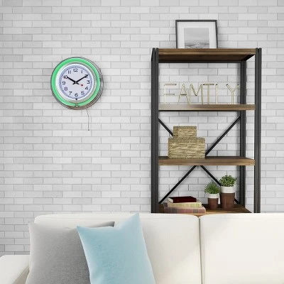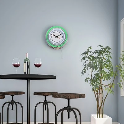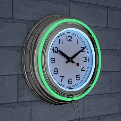 - CLASSIC DESIGN- This wall clock features an inner white neon band to illuminate the face, a retro neon green outer ring and chrome accents that conjures images of 50s classic cars, cherry sodas at the diner and cruising the strip on Friday nights