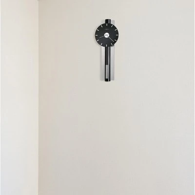 - Modern Style: This eye-catching wall clock has contrasting black and silver tones for modern elegance. It’s enhanced with a rectangular pendulum, which has a brushed nickel finish, and it has a sleek appearance that complements any room.
