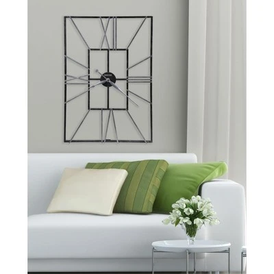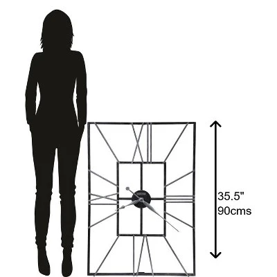 - All in the Details: Beautifully conceived with sturdy wrought iron, this attention-grabbing rectangular clock proves contemporary style is anything but cold and unapproachable. This bold piece brings to life the aesthetic in a remarkable way, utilizing color and shape to create a work of art. Its charcoal frame provides support for the aged Roman numerals and minute and hour markers, all finished in aged nickel for strong contrast.