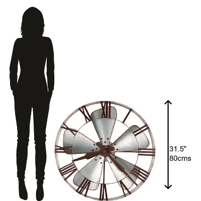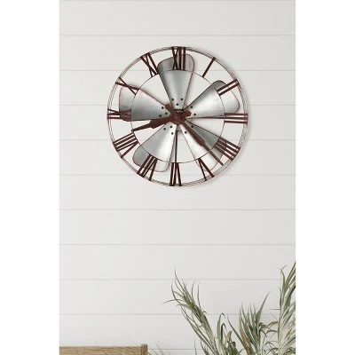 - Metallic Moments: A little rustic and a touch futuristic, this eye-catching clock is a standout thanks to its clever use of materials. It features an aged silver-finished wrought iron frame, which nicely complements the aged galvanized steel fan blades. The edges are purposefully rusted over to convey a vintage aesthetic, while the center disc and metal Roman numerals, share the same reddish-brown finish. The hour and minute hands are equally dark, creating a cohesive look that complements the rustic design perfectly.