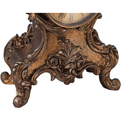 Bring timeless elegance to your desk or side table with this exquisite curved foot table clock. Bearing a traditional Roman numeral face with a sweeping second hand, the clock features a plethora of scroll and leafwork detail beautifully finished in antique gold for vintage appeal.