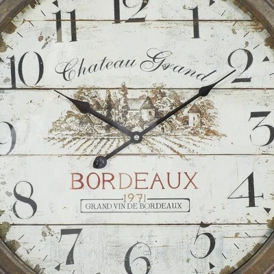 Don’t settle for a basic wall clock to keep you on time! Add this metal wall clock to your space and create a blend of amazing vintage or rustic design. This lovely accent piece provides next level charm and unexpected style to your home. It features a tarnished brown frame with beveled surface and a distressed white clock face with French-inspired illustrations. Feel free to hang this accent decor piece in your lobby, hallway, living room, bedroom, or kitchen. Display on wall with other decor pieces for a more beautiful and stylish home. Requires one AA battery, not Included. This vintage metal wall clock features a quartz face with Arabic numerals and minute marking. The clock mechanism runs silent. A loop hardware is placed at the center back section for easy hanging via nail or screw. Suitable for indoor use only. This large metal wall clock showcases vintage-themed texts of “Chateau Grand”, “Bordeaux”, “1971 Grand Vin De Bordeaux”. This item comes shipped in one carton.