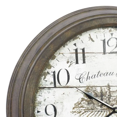 - This antique-inspired big metal wall clock features a tarnished brown and distressed white iron finishes