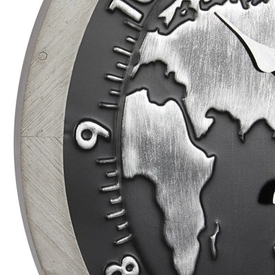 Design meets functionality in this sleek-looking and monochromatic iron-made wall clock. Its black and Gray color scheme and embossed continents design are guaranteed to stand out in vintage and modern-themed study rooms, offices, living rooms, bedrooms, and home libraries. Iron and medium-density fiber make up the 25″L X 1. 5″W X 25″H dimensions of this wall clock. Requires 1 AA batteries Not Included. Silver Arabic numeral with hour and minute marking. The clock mechanism runs silent. Hangs via an attached metal backing. Suitable for indoor use only. This item comes shipped in one carton.