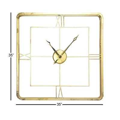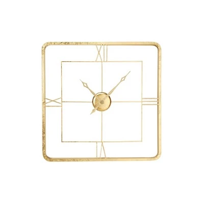 Add gilded glam style to your living room or dining room with this extra-large square wall clock with Roman numerals and a gold finish. This metal wall clock has 2 stacked frames connected by rods that pop out from wall with both matte and metallic gold finishes, adding dimensional texture to the frame, Roman numerals, and clock hands. This versatile gold clock will work with any color palette and is sure to add bold style to your space. Requires 1 AA batteries Not Included. The clock mechanism runs silent. Suitable for indoor use only. This item comes shipped in one carton.