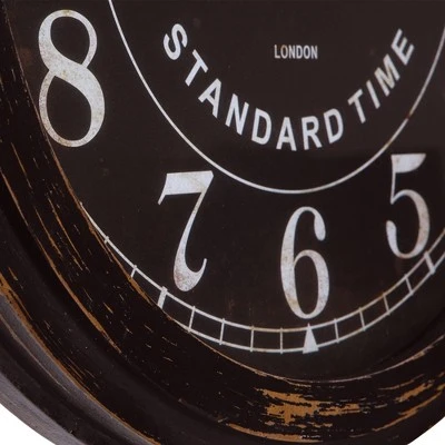Inspired by a classic timepiece, this Yosemite Wall Clock with Iron Ring is a statement piece for your home. This eye-catching clock has a sturdy hardwood face and a metal frame and top hook, all with the perfect amount of distressing to look like a vintage find. White numerals pop off the black, weatherd face of this wall clock while the hands point to the time. Hang this pocketwatch-like quartz clock in your study, living room or den.