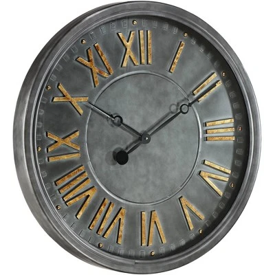 A gray finish and industrial-inspired accents adorn this handmade wall clock. The roman numerals are in a copper finish and provide a contrast to the overall design, while the classic clock hands keep the look traditional. Use this clock in any room that needs a stylish touch.