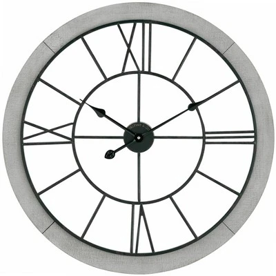 - IT’S IN THE DETAILS – This large clock has an open face and features a wood frame and wrought iron Roman numerals. The gray finish makes it a charming traditional centerpiece for any room.